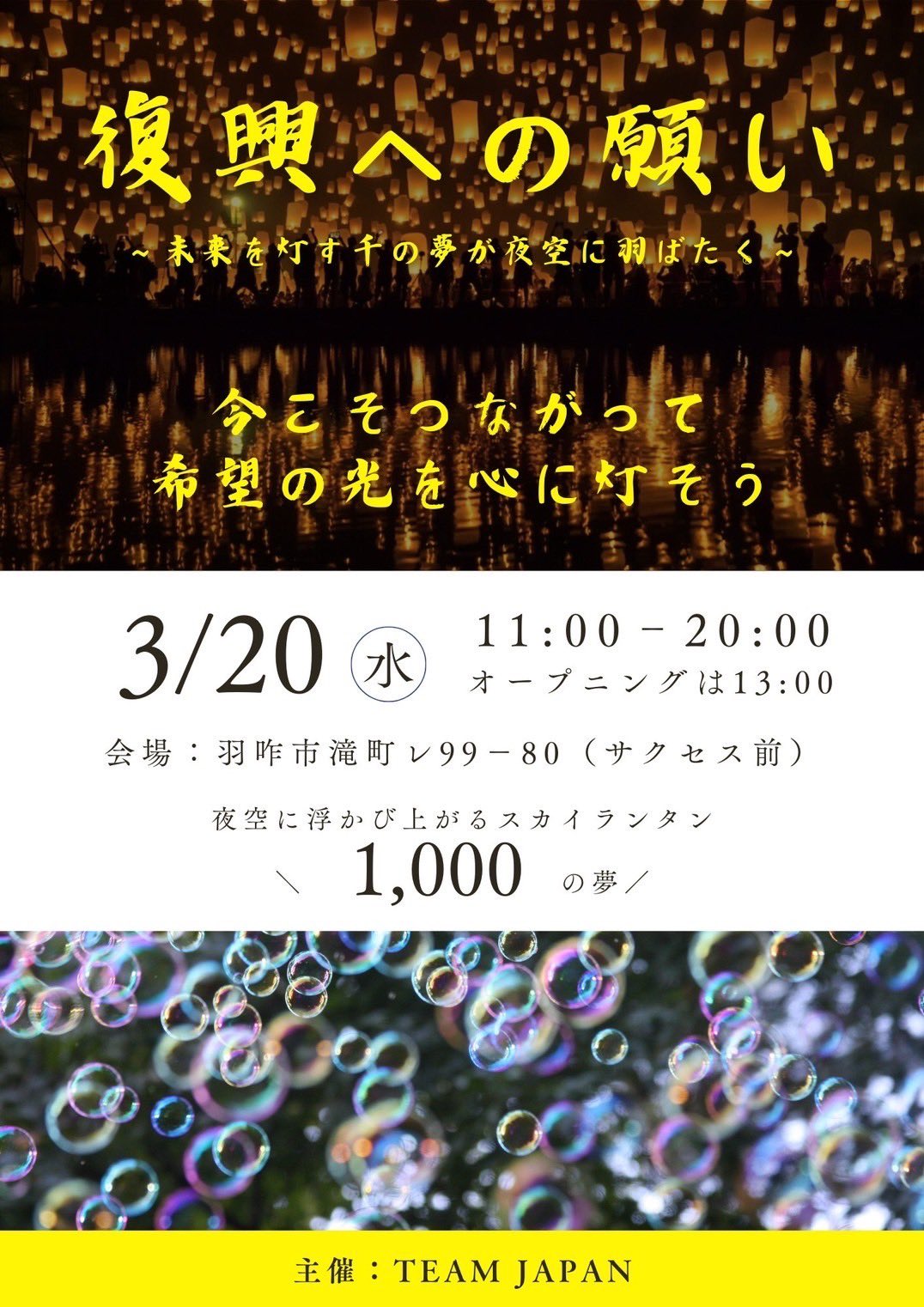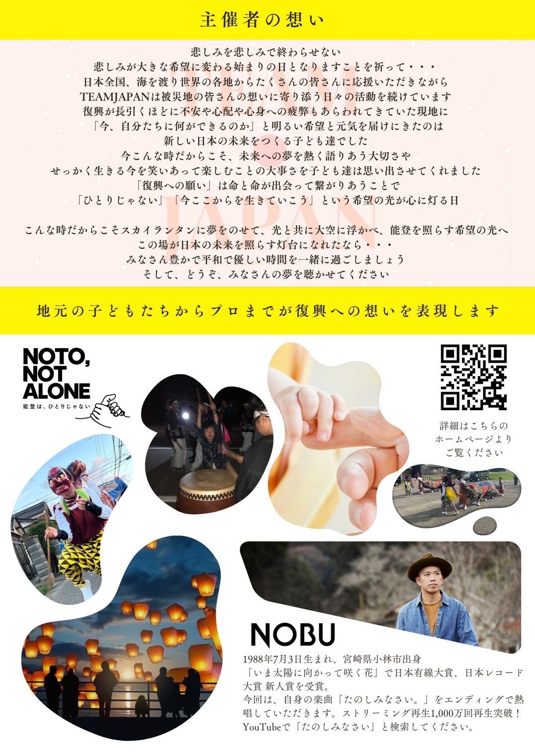 [詳細・お問い合わせ先] 催事名:復興への願い ~未来を灯す干の夢が夜空に羽ばたく~ 開催場所:石川県羽咋市滝町99-80(サクセス前) 主催:TEAM JAPAN https://tsunagaru358.jp/ https://www.teamjapan2024.com/